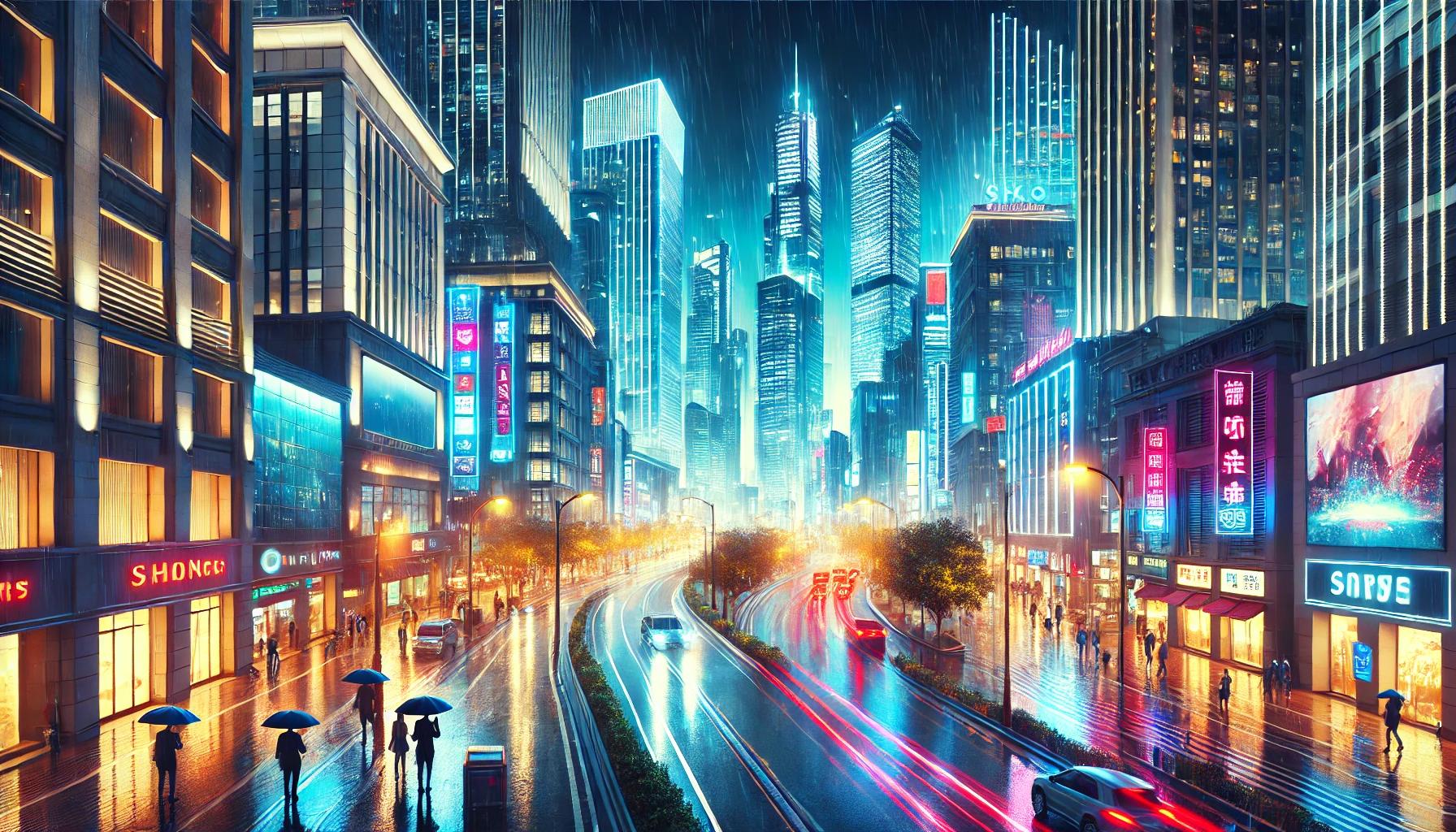- 프롬프트: "현대적인 고층 건물들이 늘어선 도시의 밤 풍경을 배경으로, 거리에는 네온사인과 자동차의 불빛이 어우러져 있다. 도로에는 반짝이는 빗물 자국이 남아 있으며, 행인들은 우산을 쓰고 바쁘게 걸어가고 있다. 생동감 넘치는 도시의 야경, 실사 스타일"