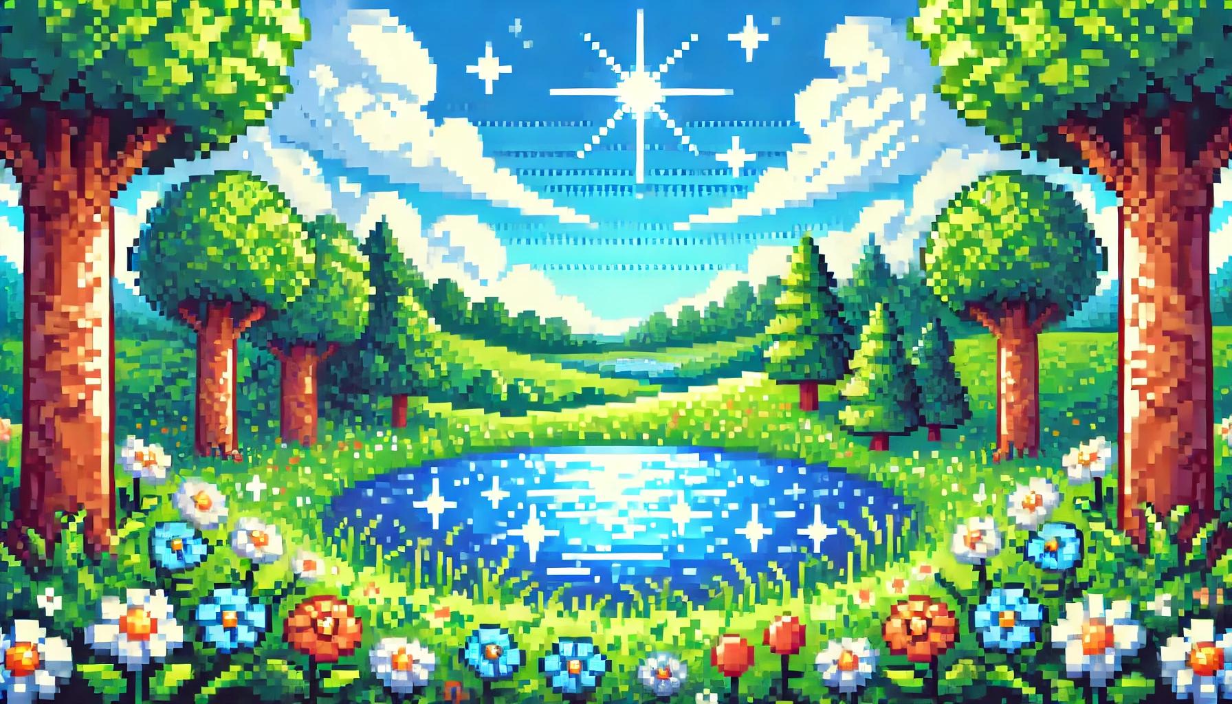- 프롬프트: "픽셀 아트 스타일로 표현된 아름다운 자연 경관. 푸른 하늘과 구름, 그리고 초록색 들판이 펼쳐져 있다. 중앙에는 작은 호수가 반짝이고 있으며, 호수 주변에는 나무와 꽃들이 픽셀로 그려져 있다. 밝고 선명한 색상으로 표현된 평화로운 자연의 모습."